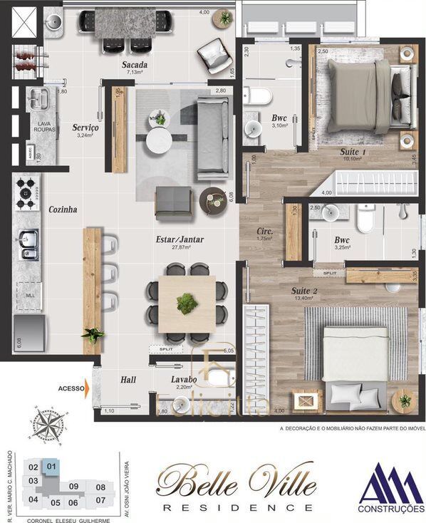 Este apartamento em construção de 2 Dormitório sendo 2 suítes com lavabo, 1 vaga de garagem, piso vinílico nos quartos, churrasqueira a carvão, porcelanato 90x90cm e com uma Área Privativa de 83,46m², está esperando por você.