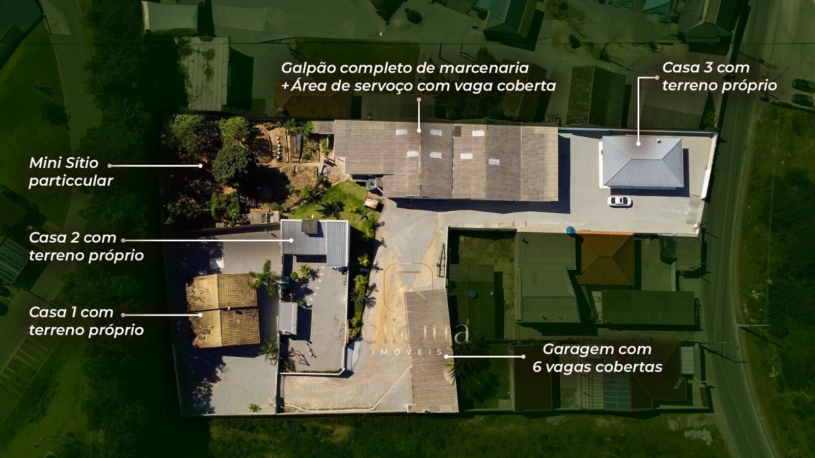 Além das 3 casas, consta um galpão que funciona uma marcenaria com 436,78m², seis vagas de garagem cobertas e um mini sítio.