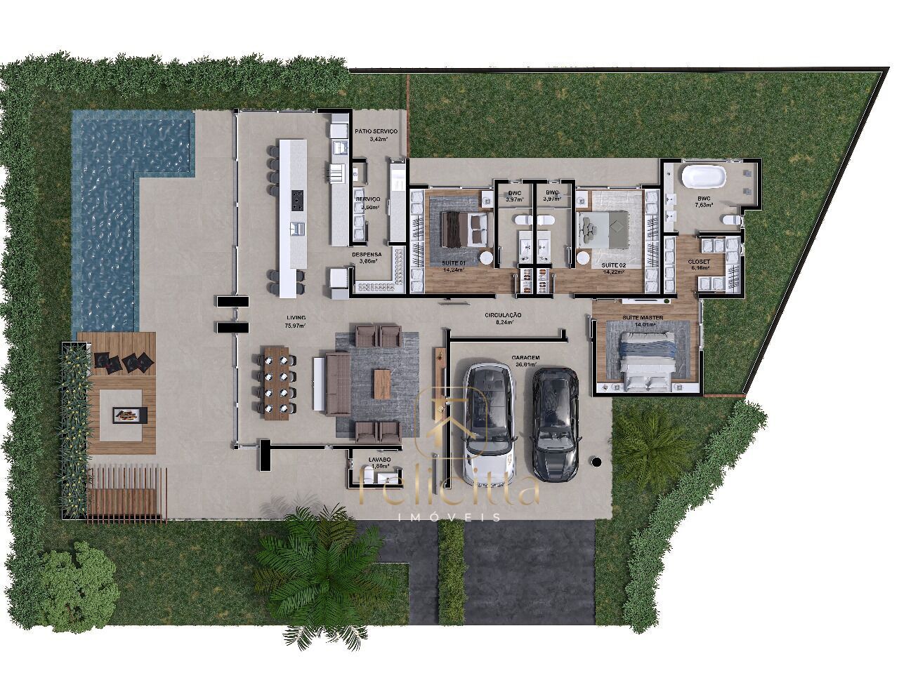 3 Dormitórios, sendo 3 suítesGaragens
